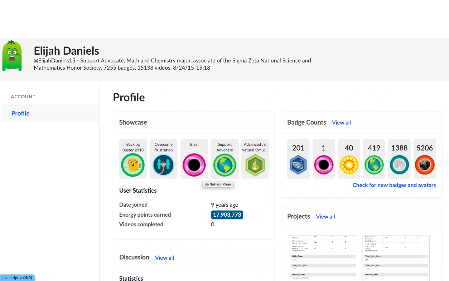 - The 100,000,000 energy points Sal has from this badge would alone be enough for a normal user to be in 7th place on the energy points leaderboard. This means that the energy points earned from this badge are more than the account total of all but 6 normal Khan Academy users.