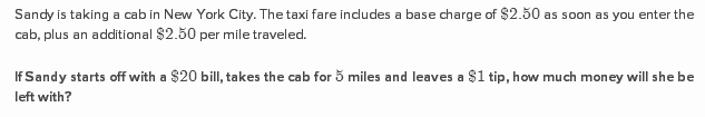 - The general form on the taxicab problem is to take the initial fee, then and add the number of units multiplied by the fee per unit, then add the tip. This amount is the total and the amount left would be this number subtracted from the amount the person had to begin with.