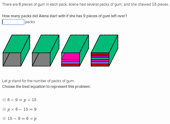 - Use picture: Strictly speaking the picture is not necessary, but it has a picture that can be used to model a situation. The user sometimes has to write an answer and sometimes has to select. The are often multiple parts to these problems.